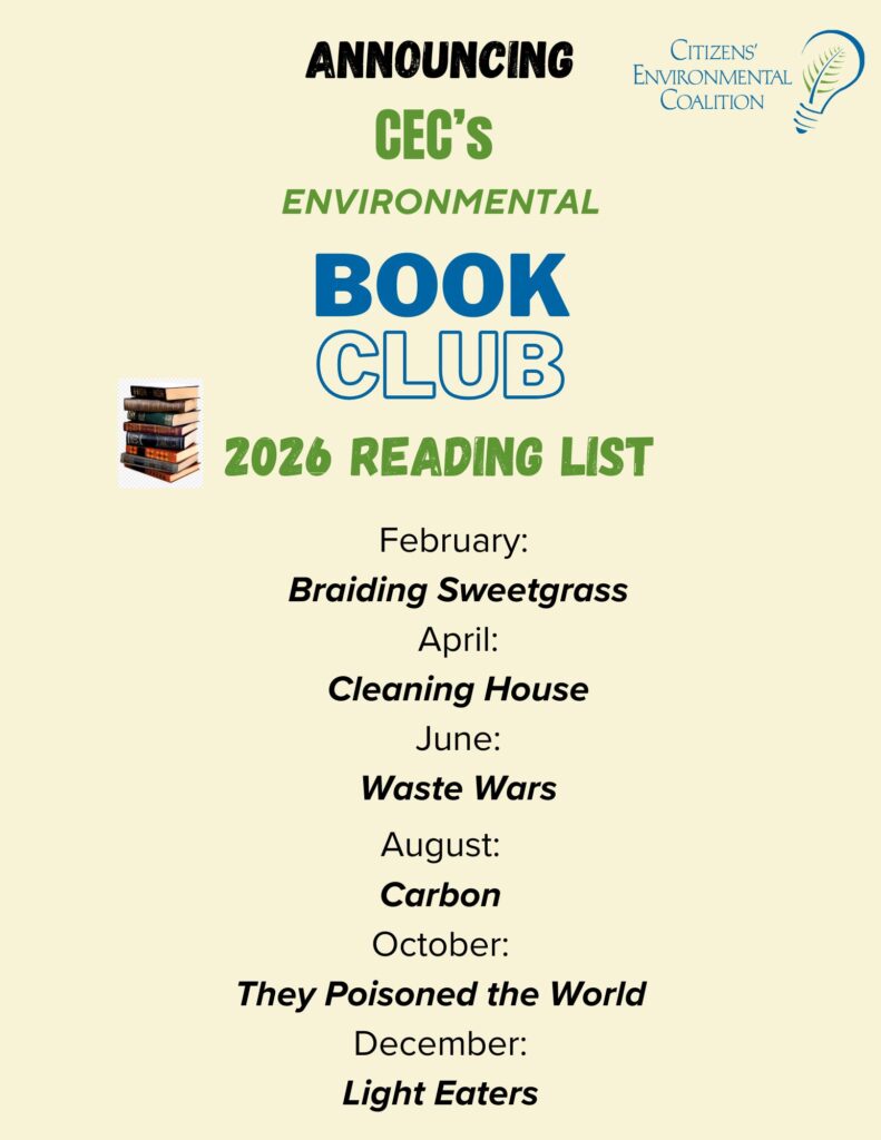 The Citizens’ Environmental Coalition (CEC) invites you to our bi-monthly Environmental Book Club, where we explore pressing environmental issues through literature. Whether you’re passionate about climate change, food systems, or environmental activism, you’ll find a welcoming community and thought-provoking discussions.